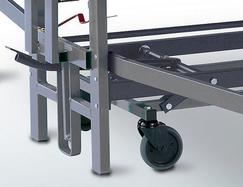 - Unique transport system operated by a foot pedal raises the table legs off of the floor for easy movement to a storage location